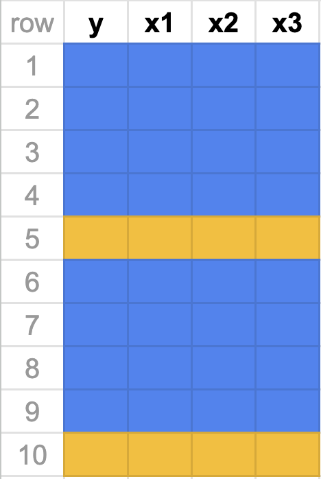 The original data frame consists of 10 observations. For each observation we have recorded a response variable, \(y\), and three predictors, \(x_1, x_2\), and \(x_3\). If we do an 80-20 split, then 8 of the rows will randomly be assigned to the training set (in blue). The 2 remaining rows (rows 2 and 6) are assigned to the testing set (in gold).